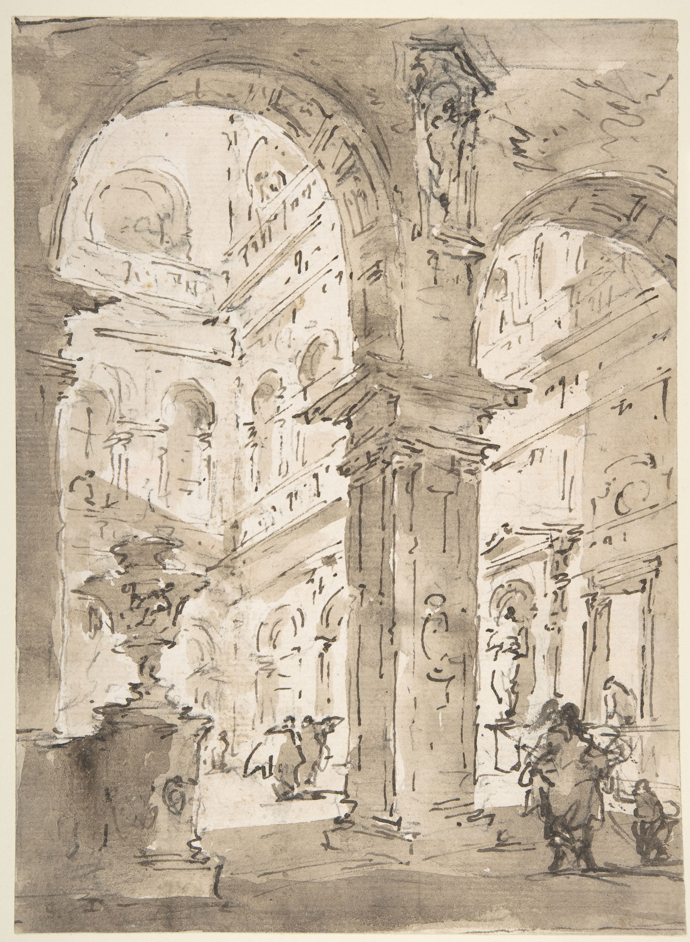 The Capricci, an influential series of etchings by Gianbattista Tiepolo (1730s?, published in 1743), reduced the architectural elements to chunks of classical statuary and ruins, among which small groups made up of a cast of exotic and elegant figures of soldiers, philosophers and beautiful young people go about their enigmatic business. No individual titles help to explain these works; mood and style are everything. A later series was called Scherzi di fantasia – "Fantastic Sketches". His son Domenico Tiepolo was among those who imitated these prints, often using the term in titles.